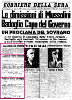 [At left, a page from the Italian newspaper. Translation: "The Dismissal of Mussolini: Badoglio Head of the Government. A Proclamation From The King", Corriere della sera, 26 June 1943]. All graphics courtesy of "Tra guerra e Resistenza".