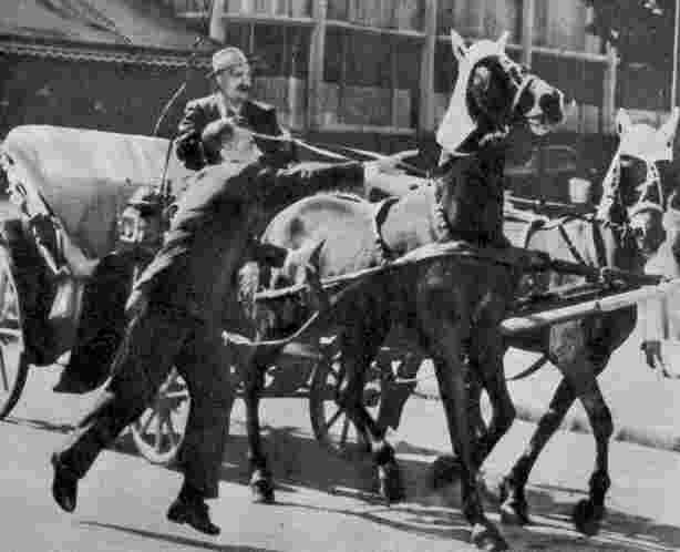 They hurry toward the door, where Cary spots a horse-drawn carriage passing slowly by.Tony runs in pursuit of the carriage, which is drawn, as luck would have it, by a horse which has no desire to run anywhere ... and as the driver doesn't seem to have heard Tony's desperate calls, the young man physically arrests the carriage with a diligence that would be strongly applauded in a western. The carriage finally is stopped, and the two young people climb aboard quickly but then waste precious minutes explaining their destination to the coachman. The horse then attacks the climb with a pace that would have delighted the two lovers, were they not so full of anguish at being late.