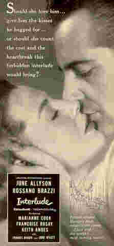 "Brazzi had just completed the final scenes of Interlude at U-I. He had just finished these scenes the day we talked and was leaving Hollywood by train for New York and then to Europe for commitments. He explained he was sailing as he doesn't like to fly. "I had a bad experience once," he said, "If I must fly for my work I do so. Once, while I was in the air, I got word one of my friends had died on a plane. Another time when a plane was to land in Rome we got off course and came down in Milan. It was very unpleasant."Interview with Hedda Hopper, 2/17/57 Review/SynopsisInterlude is the picture Rossano Brazzi began in Munich, co-starring with June Allyson, last fall. I asked him how he got on with her: "Oh, fine," he said. "She is a kid -- that is, she looks like one, but she's a good actress. We worked hard and fast in Munich. She was not happy over there. It was raining, and no time for fun. The story is similar to Summertime. I have a wife, but in this one the wife is insane. My role is serious, but June has a way to keep everything light. I saw the picture a few days ago -- it wasn't quite finished, but I liked it. I believe June and I give something to each other that shows up in the film.
